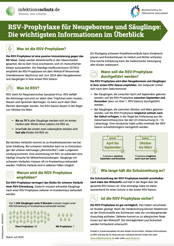 Die RSV-Prophylaxe soll allen Neugeborenen und Säuglingen während ihrer ersten RSV-Saison einen Schutz vor schweren Atemwegserkrankungen durch diesen Erreger bieten. Die Gabe sollte daher möglichst zeitnah zur RSV-Saison erfolgen.