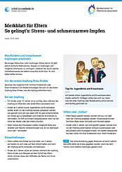 • Kinder ab 3 Jahren sowie Jugendliche und Erwachsene sollten direkt vor der Impfung darüber aufgeklärt werden, wie geimpft wird und was dabei hilft. Es gibt einfache Mittel, um Stress gut zu bewältigen und mögliche Schmerzen zu vermindern. So hilft es Kindern beispielsweise, wenn sie die Hand der Mutter oder des Vaters drücken.