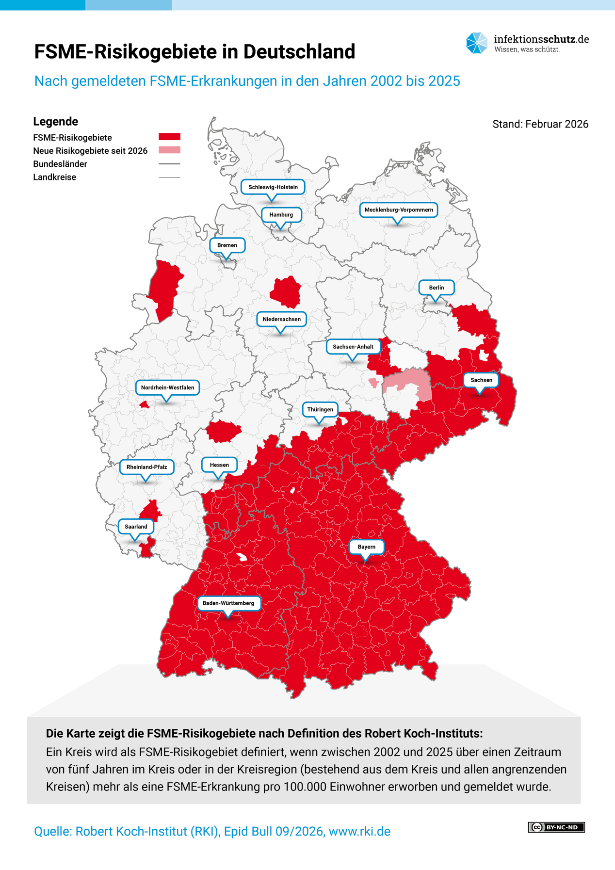 In Deutschland kommt FSME vor allem in Bayern, Baden-Württemberg, Südhessen, im südöstlichen Thüringen, in Sachsen, im südöstlichen Brandenburg und östlichen Sachsen-Anhalt. Einzelne Risikogebiete befinden sich zudem in Mittelhessen (Landkreis [LK] Marburg-Biedenkopf), im Saarland (LK Saarpfalz-Kreis), in Rheinland-Pfalz (LK Birkenfeld), in Niedersachsen (LK Emsland und LK Celle) und in Nordrhein-Westfalen (Stadtkreis [SK] Solingen). Nun sind zwei Risikogebiete hinzugekommen: In Sachsen kommt der LK Nordsachsen hinzu. In Sachsen sind damit alle Regionen mit Ausnahme von SK und LK Leipzig als FSME-Risikogebiet eingestuft. Als dritter Kreis in Sachsen-Anhalt wird der SK Halle (Saale) Risikogebiet. Damit sind in Deutschland aktuell 185 Kreise FSME-Risikogebiete. Das Robert Koch-Institut (RKI) veröffentlicht in jedem Frühjahr eine aktuelle Karte mit den FSME-Risikogebieten in Deutschland.
