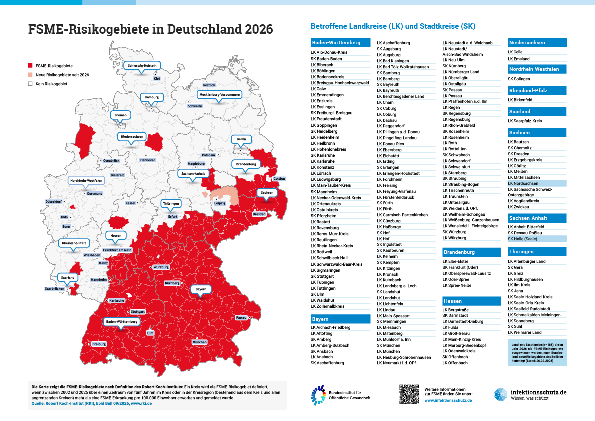 Die Infografik „FSME-Risikogebiete in Deutschland mit Landkreis-Tabelle“ zeigt die aktuellen FSME-Risikogebiete und enthält zusätzlich eine Liste mit den betroffenen Land- und Stadtkreisen.