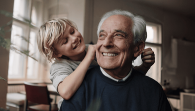 Ein Älterer Herr hat ein Baby auf dem Arm und lächelt es an