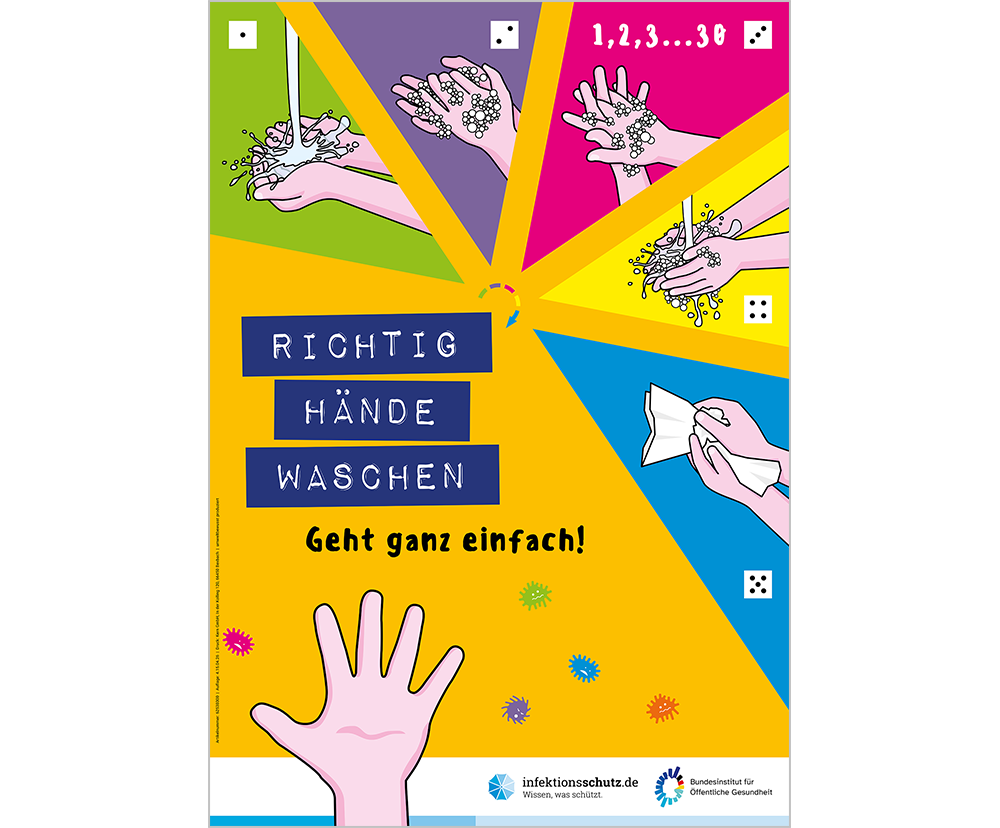 Informationen zum persönlichen Infektionsschutz durch Hygiene Weitere Aufkleber zum Thema "Händewaschen" für andere Zielgruppen finden Sie unter folgenden Links: Kindertagesstätten - kleiner Aufkleber Kindertagesstätten - großer Aufkleber Grundschulen - kleiner Aufkleber Grundschulen - großer Aufkleber Weiterführende Schulen - kleiner Aufkleber Weiterführende Schulen - großer Aufkleber